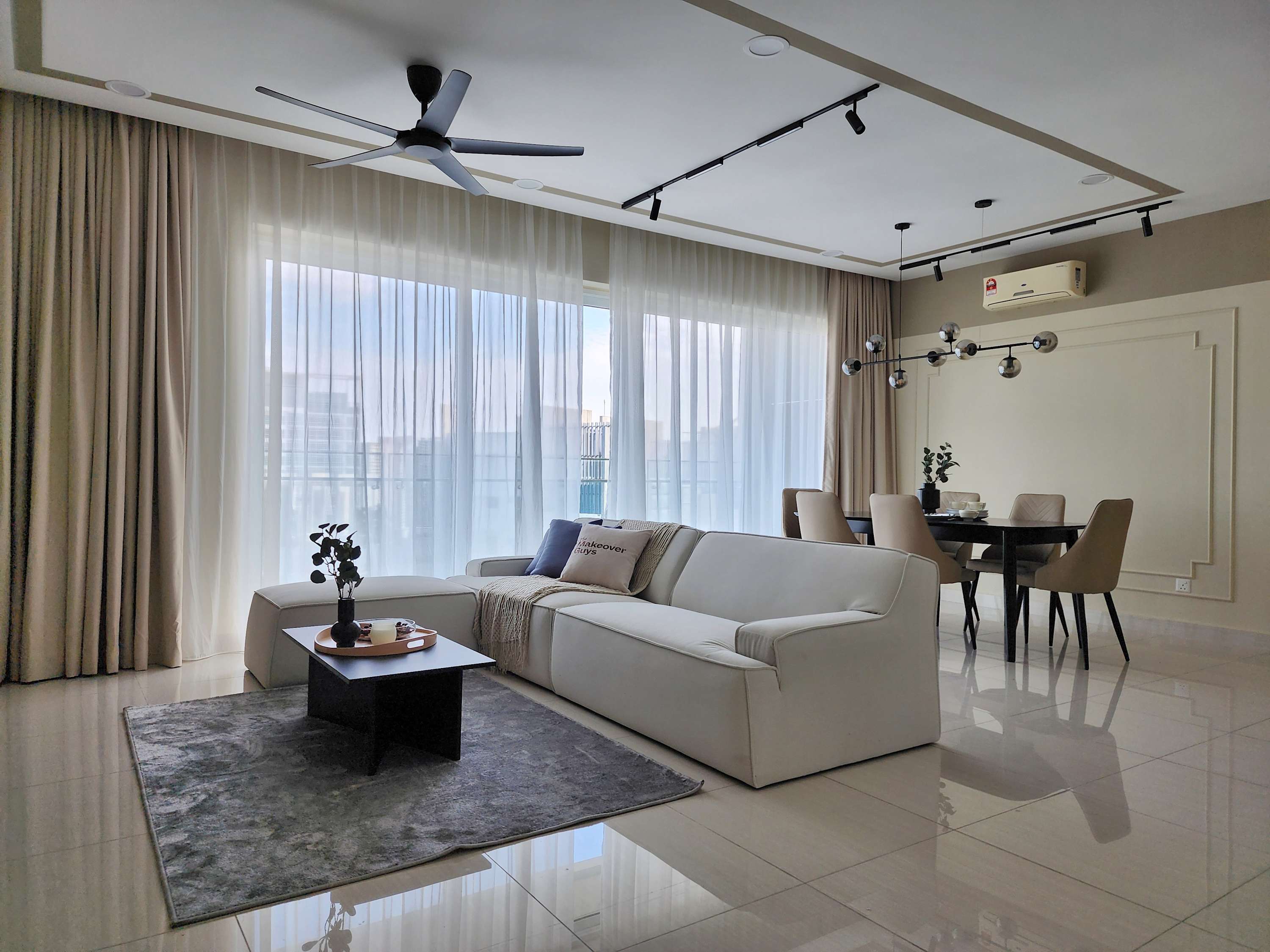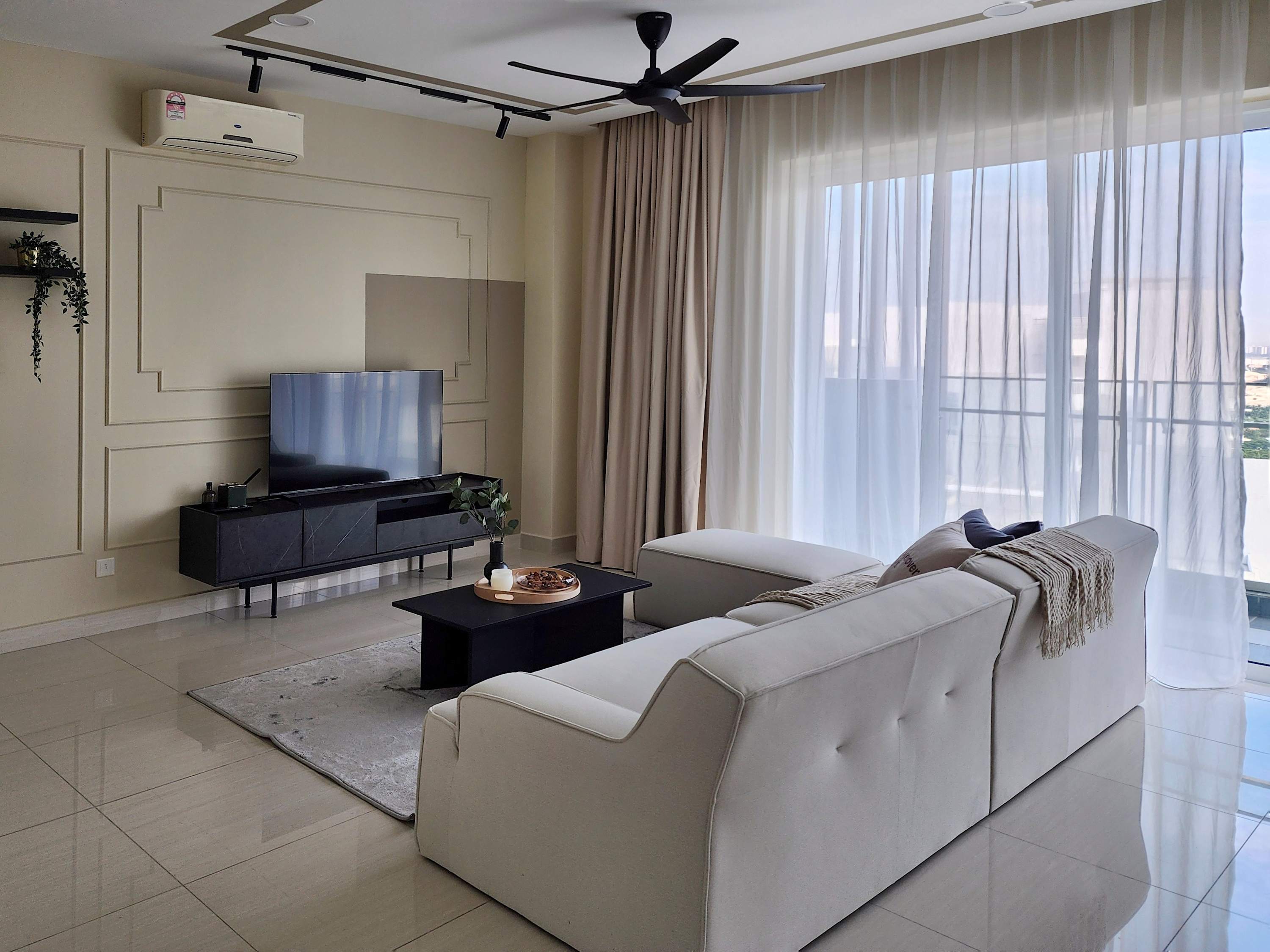 • Living Area: A spacious lounge with a comfortable sofa, smart TV, and floor-to-ceiling windows offering panoramic city views.